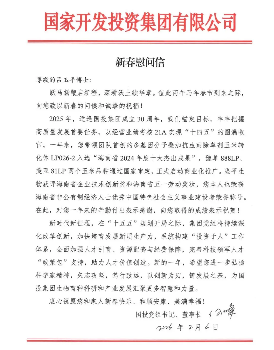 亲爱的各位领导、各位股东、合作伙伴,亲爱的隆平生物全体同仁及家属们:岁序更替,华章日新;春潮涌动,万象启新。值...